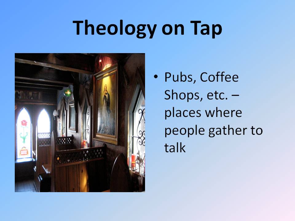 In terms of content, the world is a complicated place. Historically the evangelical churches (in particular) have had an amazing capacity to experiment and find fresh expressions of the gospel that speak into the culture. What I think we are called to today is to rise up to the challenge of culture once again. We don't shy away from tough subjects in our theology pubs. I know Mark did his first one on hell, great subject. We need to recognize that most people are wrestling with the ideas we once thought were settled - and that this is not a bad thing. At Freedom we've taken on everything from the Eucharist to homosexuality. And they have been wonderful conversations. What I would encourage is that you don't just come in with your already established opinions. Either do some research into the subject and the various perspectives on the subject, or find someone who has been working in this area. I often invite someone from one of the universities to participate. They don't lecture, they are just there as another person in the conversation. There are folks out there who would love to come and be part of such a conversation, often we tell them we'll buy them a pint for coming - but most enjoyed themselves so much we had to fight to pick up their pub tab!